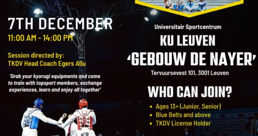 Onder leiding van bondscoach Egers Aliu en samen met onze topsporters Troy en Andes Cammaerts en Elien Rabaut, kunnen geïnteresseerden (leeftijd +13, blauwe band en hoger, houder van TKDV-licentie) aansluiten bij een open topsporttraining.